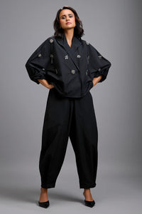 Featuring Eclipse Embellished Cropped Power Set by Deepika Arora's Eclipse Collection. A contemporary cropped blazer with embellished sleeves and a wrap-front design, paired with tapered drop-crotch pants for a sharp, fashion-forward statement.