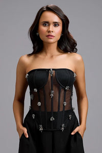 Featuring Eclipse Sheer Rhinestone Bodice by Deepika Arora's Eclipse Collection. This sheer, corset-style bodice dazzles with intricate rhinestone embellishments, combining bold allure and refined elegance for a statement look that effortlessly transitions from glamorous evenings to high-fashion occasions.