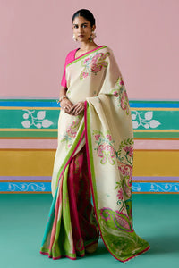 Elegant and timeless, the Ecru and Green Paisley Saree features a green and pink paisley print on an ecru base. Delicate pearl tassels adorn the pallu, while a contrast facing along the border adds depth—making this saree perfect for both festive and intimate gatherings.