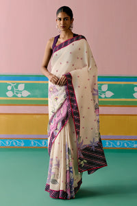 Classic yet contemporary, the Ecru and Purple Ikkat Saree features a striking purple ikkat print on an ecru base. Delicate pearl tassels adorn the pallu, while a contrast facing along the border adds depth—creating a timeless drape that balances tradition with modern charm.