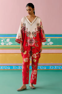 Light and graceful, the Ecru & Red Floral Kaftan Set is crafted in soft Chanderi with lace detailing on the neckline and sleeves, and intricate hem accents. Paired with elasticated pants, it offers effortless comfort and an elegant balance of ease and sophistication for festive occasions.