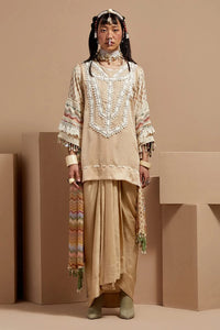 Featuring the Ecru Basque Mitra Short Kurta Set With Dupatta by Aseem Kapoor's Basque Collection. This off-white silk and organza set includes a textured solid short kurti with embroidered yoke and tribal tassel details on the sleeves, paired with a textured solid drape skirt. Finished with a chevron print dupatta, the ensemble offers a relaxed fit with an easy fit kurta and elasticated waist skirt for ultimate comfort.