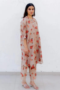 A handblock-printed relaxed-fit Ecru Co-ord Set in handwoven chanderi, featuring intricate resham and mirror hand embroidery on the kurta's placket and sleeve edges. Crafted with natural-dyed hand block prints, the set is paired with cotton trousers, also adorned with hand block prints in natural dyes, creating a harmonious and elegant ensemble.