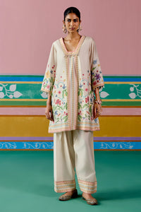 Chic and contemporary, the Purple Ikkat Jacket Set is crafted in airy Chanderi for a statement festive look. The sleeveless jacket features a full lace border, dori tie-up details, and tassels. Paired with a smocked-back bralette and elasticated waist pants, it blends ease with elegance.