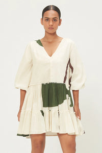Crafted in airy cotton mul, bold abstract leafy print of forest green and earthy brown streak across a creamy canvas. Designed with a soft V neckline and full-length puff sleeves finished with gentle elasticated cuffs, it balances volume with ease. Godet panels at the hem create fluid flares , perfect for days that call for quiet elegance and comfort.