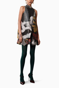 The Ecru Short Dress is a charming layered mini dress that exudes elegance with its high collar and ruffled hem. Crafted from luxurious Linen Satin fabric interwoven with silver zari, this dress features a subtle shimmer, adding a touch of opulence to its timeless design. Perfect for both daytime chic and evening affairs, it combines texture and delicate detail for a refined look.