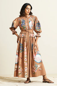 A pleated maxi dress crafted out of soft cotton cut in a comfortable silhouette. The dress highlights digitally placed hand painted botanical motifs. It features a mandarin collar, side pockets, slight gathers on sleeves with elasticated cuff
