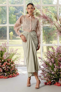 The edwina co-ord is a luxurious combination of pure silk organza and silk chanderi, designed for summer weddings, cocktails, or destination celebrations. the soft peach hue and refined fabrics offer an elegant, glamorous look, perfect for the spring/summer season. a sophisticated choice for formal occasions, blending modern style with timeless charm.