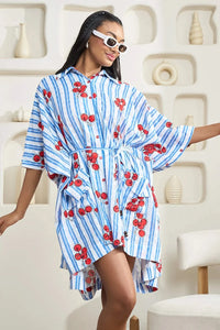Effortlessly breezy and beautifully detailed, this short blue dress in cotton schiffli features an all-over print, playful button accents, and a hidden belt for a cinched silhouette. Finished with a matching tie-up detail for that extra flair, it’s sunshine dressing, done right.