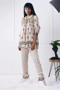 The Beige Ela Printed Shirt with Straight Pants in Cotton Silk is a chic and elegant ensemble. The printed shirt adds a touch of artistry, while the straight pants provide a sleek, tailored silhouette. Crafted in breathable cotton silk, this outfit is perfect for both casual and semi-formal occasions, offering a blend of comfort and style.