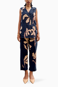 Featuring a blue lino print mul co-ord set. The relaxed tunic comes with front button opening and front pockets. Comes with regular fit trouser with side seam pockets, front button opening and an elasticated back.