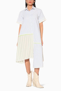 The Elara Dress is a crisp, modern shirtdress featuring artfully arranged multi-stripe panels and refined detailing. Its tailored silhouette and playful pattern mixing create a polished yet contemporary look, perfect for effortless day-to-night style.