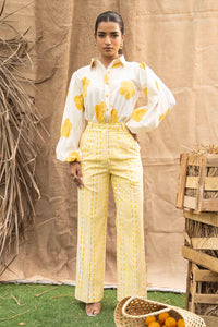 Introducing Elea – a striking printed coord set that blends floral and geometric patterns for a unique and stylish look. The floral-printed shirt features lace detailing at the front and back, adding an elegant touch, while the voluminous sleeves bring drama and movement. Paired with high-waisted flared pants, this set offers a perfect balance of comfort and chic sophistication, making it ideal for both casual outings and more elevated events.