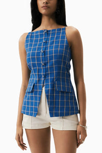 Featuring the Electric Blue Deccan Vest by OSHIN's SS'25 collection. This vest showcases a boat neck detail, short shoulder straps, and a front button closure. Fitted at the waist with a regular top length, it offers a sleek, structured silhouette.