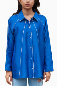 Featuring Electric Harper Shirt by URAIB from The Colored Castle Collection. Tailored from Chanderi fabric, this shirt boasts a bold and stylish look with its captivating blue hues, ensuring a distinctive wardrobe essential.