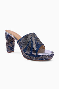 Our Electric Nakhra perfect platforms exude confidence, charm, and a whole lot of breathtaking energy. The navy satin base is an eye-catching canvas for a rich mix of Indian embroideries: zardozi, salli, and zari work.