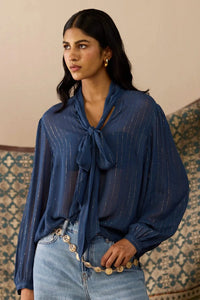 Timeless and refined, the Elegance Blouse is crafted in lightweight georgette with delicate vertical lurex detailing that adds a subtle shimmer. Designed with a chic tie-neck feature, it elevates any look with effortless sophistication. The sheer, oversized silhouette offers versatility—style it over a black bra for a bold statement or with a camisole for added coverage. Perfect for day-to-night dressing, this blouse is all about understated glam.