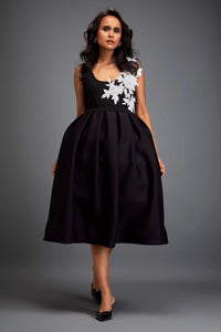 An elegant black dress featuring intricate white hand embroidery embellished with Swarovski crystals, paired with a voluminous skirt that adds a dramatic and sophisticated touch