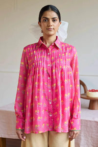 Introducing the handwoven Chanderi relaxed-fit shirt, Adorned with florette prints, soft and bright, A green border trims the collar and cuffs, A subtle touch, a nature's delight.