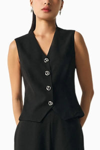 A structured vest with a tailored fit, featuring statement buttons for a refined look. Its sharp silhouette and versatile design to make it perfect to wear indivisually or as a layering piece.