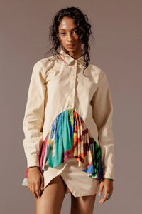 An oversized A-line shirt with printed gathers and contrast piping detail.