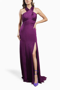A captivating blend of elegance and allure. Its criss cross halter neck, gathered torso, and side slit accentuate the silhouette with sophistication. Crafted in rich violet, this gown exudes regal glamour and is perfect for special occasions that demand a memorable presence.