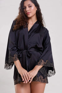This sleek black satin robe combines comfort with a touch of sophistication, featuring floral embroidery on the sleeves for added style. Designed specially with luxury fabrics with great attention to detail and made ethically in our atelier. The above-the-knee length makes it perfect for lounging or as a chic layer to your nightwear. With a tie closure for an adjustable fit, this robe flatters all body types and adds effortless elegance to any occasion.
