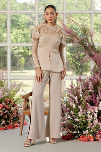 The eloise co-ord in beige features a luxurious pure silk organza shirt paired with an italian crepe skirt in a soft beige hue. ideal for summer weddings, formal events, or elegant summer dresses, this set blends contemporary style with timeless sophistication.