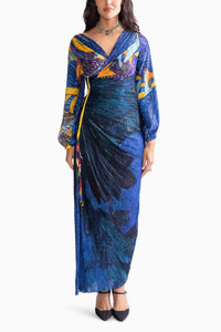 Featuring Eloise Blue Dress by Saaksha & Kinni from Botanica Collection. A dual daisy and tribal print dress with hand micro pleats, showcasing a surplice bodice and a customizable side slit for a chic and adjustable look.