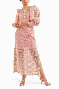 Introducing an enchanting Organza Maxi Dress, adorned with delicate floral embroidery. It features a chic zero neckline, puff sleeves, and playful tassels at the front and on the slits. The maxi Dress is lined with a short dress lining and includes a convenient side zip for a flattering fit. Perfect for any special occasion!