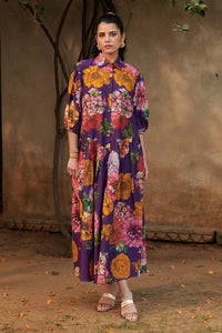 A relaxed fit drop-waist dress with shirt collar featuring a front button placket, with puff tie-up sleeves, gathers at the lower waist, and inseam side pockets.