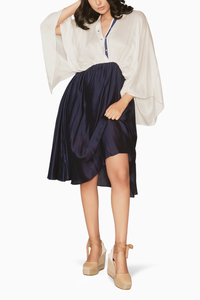 Featuring Elvira White and Blue Dress by Chillosophy from Lovefool Collection. This exquisite soft kaftan, draping beautifully for a relaxed silhouette. The U-shaped ruche detail adds visual interest, while the airy batwing sleeves create a breezy feel, has a collared soft kaftan in colour blocking and a front button opening, perfect for your tropical escape.