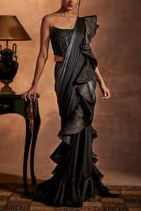 Featuring Black and Grey drape saree on georgette fabric with organza frill. The blouse has a beautiful silhoutte and is embellished with sequin and swaroski.