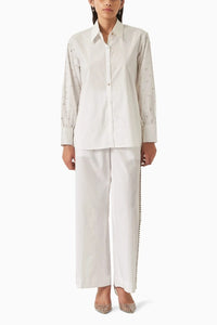This all-white ensemble offers a refined take on contemporary minimalism. The white cotton basic shirt is subtly elevated with shimmering crystal embellishments along the sleeves, adding a touch of understated glamour. Paired with white cotton pants featuring a sleek stud line embellishment, the look is clean, polished, and effortlessly chicâ€â€Âperfect for both day and evening wear.