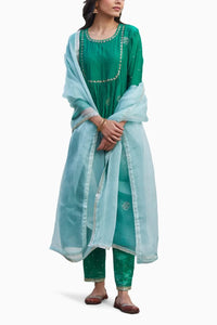 This Handwoven Chanderi Comfort-Fit Kurta Set in stunning shades of green is elegantly embellished with dabka, sequins, and zari hand embroidery on the kurta, dupatta, and trouser hemline. Paired with soft cotton trousers for a comfortable fit, the set is completed with a luxurious organza dupatta, adding a touch of refinement and grace. Perfect for festive occasions, this ensemble blends traditional craftsmanship with modern sophistication.