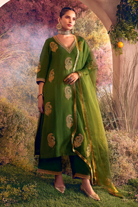 Step into elegance with this sophisticated Green-Colored Straight Kurta Set, meticulously designed to showcase exquisite craftsmanship and luxurious fabrics. The upper part of the suit is crafted from linen, offering a crisp and breathable texture that complements the ensemble's structure. The lower part features silk fabric, adding a touch of richness and elegance to the outfit's silhouette. The ensemble is adorned with marori work, skillfully executed with resham threads, which intricately embellish the suit's neckline, sleeves, and borders, creating a tapestry of traditional motifs and designs. Completing this ensemble is a dupatta made from sheer organza, delicately embroidered by hand across its entirety.