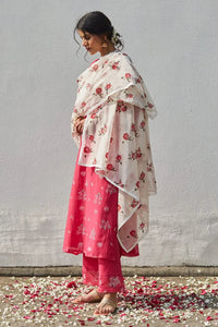 Elevate your style with this vibrant fuchsia handwoven chanderi comfort-fit kurta set, adorned with elegant mallipoo block prints on the kurta and trouser bottom. Paired with a handwoven chanderi dupatta featuring delicate jasmine and rose prints and lace-trimmed edges, this set blends traditional craftsmanship with modern comfort. The cotton trousers ensure a relaxed yet chic look, perfect for any occasion.