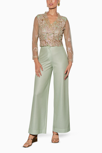 Sage embellished blazer and pants set with mesh top.