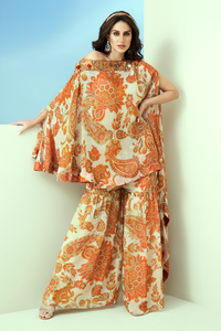 The Off White Printed Neck Embellished One Shoulder High Low Kaftan with Sharara Pants and Bustier features a modern one-shoulder design with a high-low hemline, offering a chic and sophisticated silhouette. Adorned with intricate embellishments around the neckline, it adds a touch of elegance and sparkle to the outfit. Paired with the kaftan are Sharara Pants, which complement its design flawlessly. The Sharara Pants feature a wide-legged silhouette that flares dramatically from the knees, offering movement and grace.