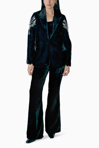 Featuring velvet blazer with pearls and stones embellished sleeves paired velvet a line pants and bustier