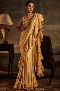 Featuring Gold drape saree on satin georgette fabric with frills the blouse is embelished with sequin and sworoski.