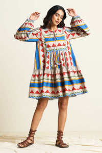 Made from soft and luxurious cotton, our Ember dress features geometric print cut in flattering silhouette. The neckline is beautifully finished with a delicate hand embroidery and hand-made beaded tassels.