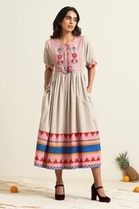 The Ember Peasant Dress combines nostalgia with modern style. The hand embroidered yoke adds a touch of artistic charm while the geometric print gives it a contemporary edge.