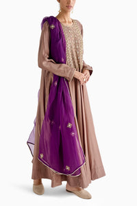 Featuring an Anti-Fit Anarkali adorned with intricate embroidery on the neck, accompanied by matching pants and a stunning purple embroidered dupatta. The silhouette of the Anarkali offers comfort without compromising style, while the delicate embroidery on the neckline adds a hint of sophistication and charm.