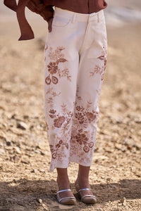 Barrel-shaped white denim pant with earth-toned floral satin stitch embroidery placed on the front and back. Delicate embroidery runs up from the bottom hem along the side seams. Belt loops at the waist with hook/eye and zip closure. Pockets in the sides and back.