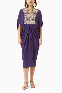 Drape cowl kaftan in a soft flowing crepe fabric. Placement gara stitch inspired embroidery in lurex thread around a V-neck. Relaxed fit.