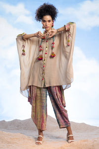 Embrace effortless style with this Embroidered Double Collar Boho Top in Ecru, featuring a front-open, loose fit design. Paired with vibrant Tie-Dye Dhoti Pants in shades of Vintage Pink, Lime, Lavender, and Deep Ecru, crafted from a luxurious cotton-silk blend. This set combines boho elegance with rich, flowing textures for a chic, laid-back look."
