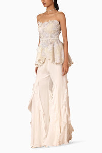 Presenting Shriya Som's gradient corset-style peplum top from the Chrysalis Collection, featuring intricate 3D floral embroidery on a delicate tulle base. Paired with a matching belt adorned with pearl and gitch embroidery, this top exudes sophistication and modern elegance. The ensemble is completed with ruffle pants crafted in a chiffon base, featuring cascading ruffles in a godet pattern, adding a flowing, refined touch to the look.