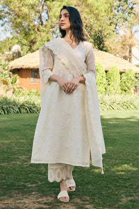 The Ecru Embroidered Kurta Set features intricate floral embroidery, sheer sleeves, embroidered pants, and a tassel-accented dupatta, offering effortless sophistication.