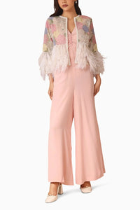 Presenting Shriya Som's embroidered feather jacket from the Chrysalis Collection, crafted in a tulle base and adorned with shimmering crystals. The design is elevated with luxurious ostrich feather accents at the hem and sleeves. Paired with a premium lachka base jumpsuit featuring a ruched bodice and intricate gitch embroidery, this ensemble exudes contemporary glamour.